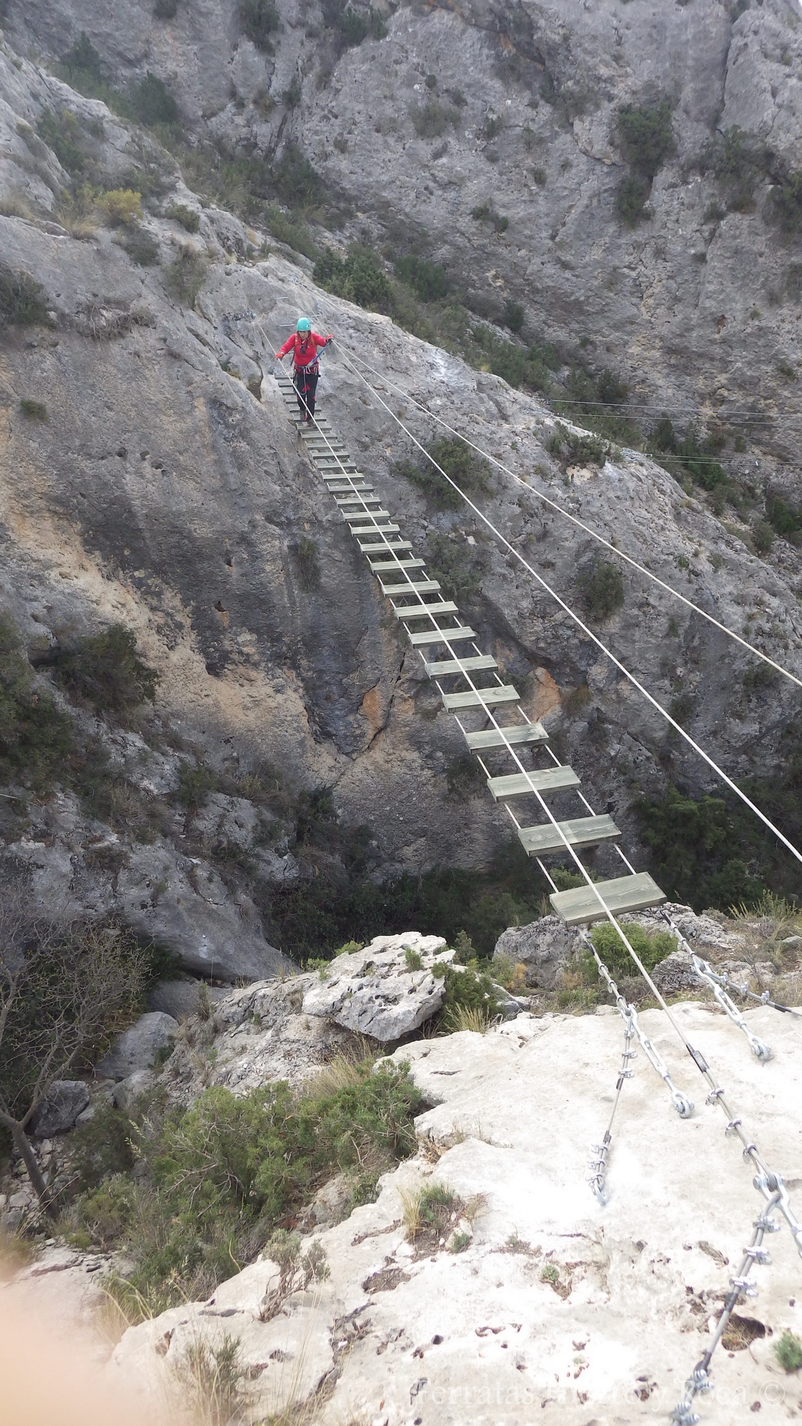 Nos encontramos ante un recorrido corto, fácil y de estilo más clásico pero muy bien diseñado ya por haber sabido aprovecha esta partes altas del este barranco tan conocido y su enclave tan bonito con unas vistas impresionantes de la ciudad de Ibi o bien por el gusto de la empresa constructora y en su elección de materiales de calidad.Empezaremos cruzando un puente mono para seguir ascendiendo en travesía y ganando algo de metros por pasos fáciles y en algunos podremos usar la línea de vida como ayuda ya que esta preparada para ello.Cuando lleguemos al segundo puente aquí ya pasamos de puente a puente y tiro por que me toca, fuera bromas sirve para aprovechar esa zona tan abierta y dar juego, una vez terminados estos puentes solo nos restara ascender la última placa hasta su final y aquí decidir si bajar `por senda o por descenso de barranco. | |||